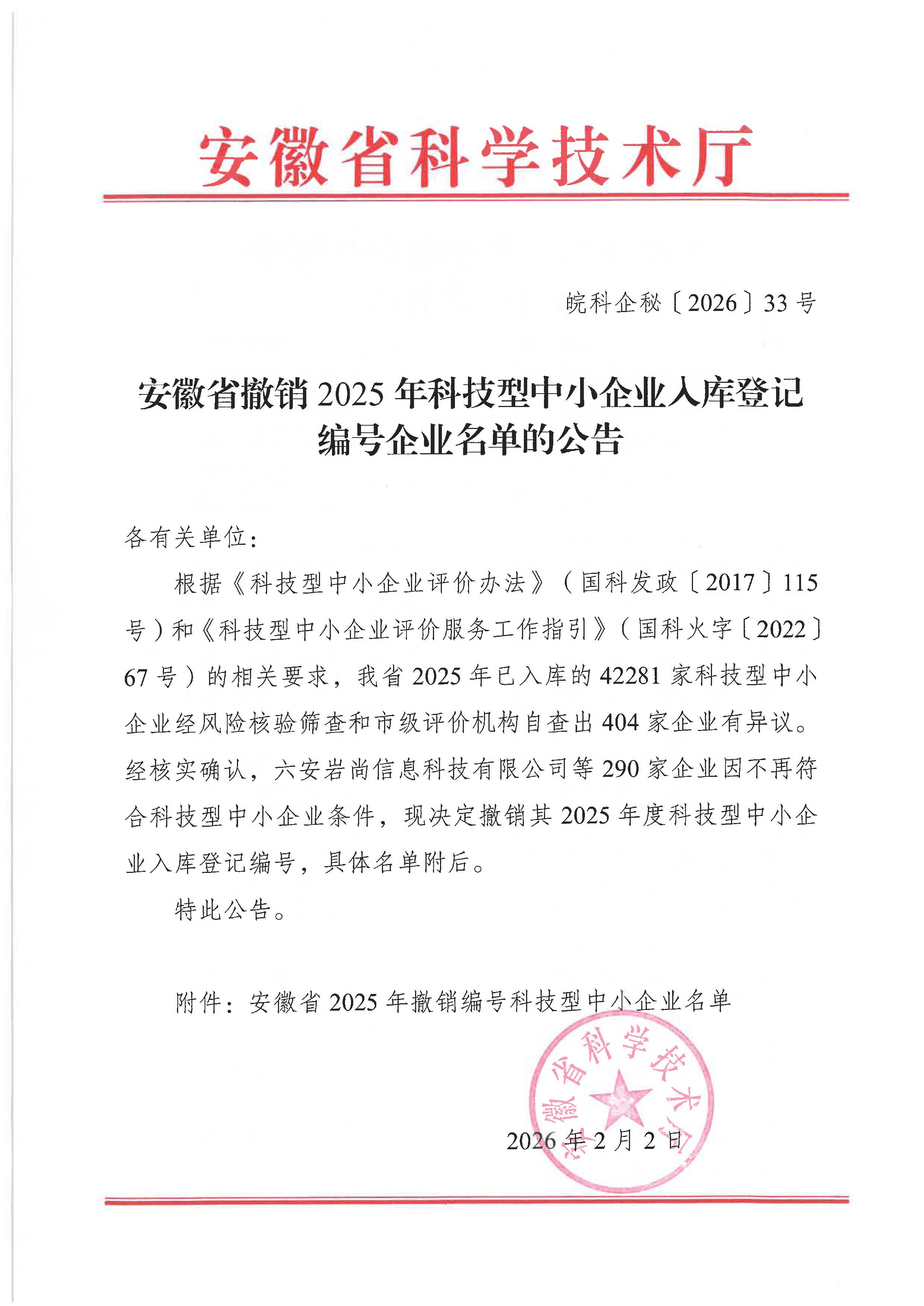 安徽省撤销2025年科技型中小企业入库登记编号企业名单的公告.jpg PICTURE