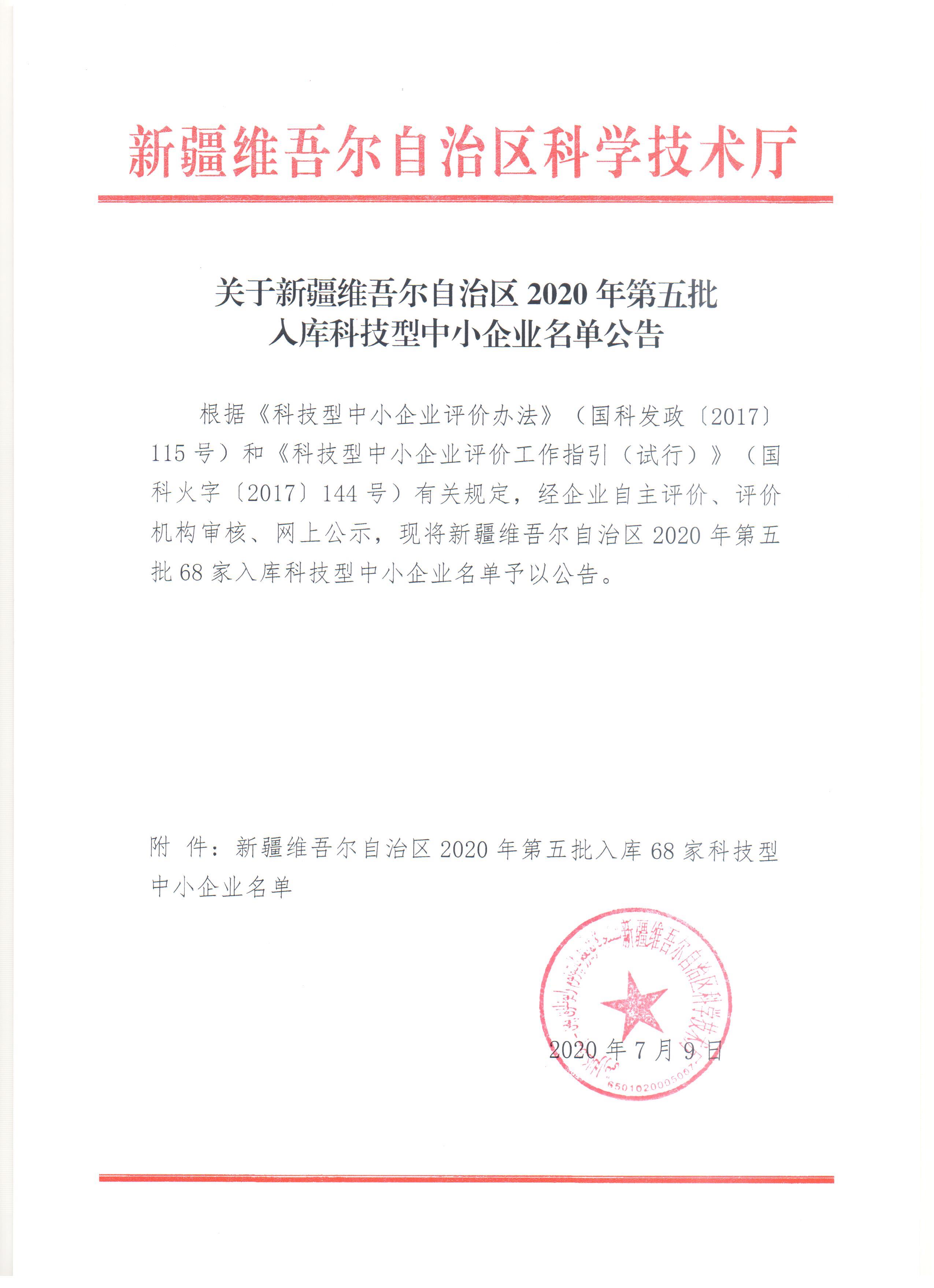 新疆维吾尔自治区2020年第五批入库科技型中小企业名单公告正文.jpg PICTURE