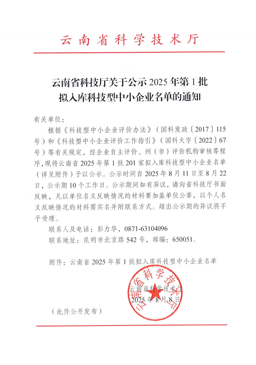 云南省2025年第1批拟入库科技型中小企业名单公示正文.jpg PICTURE